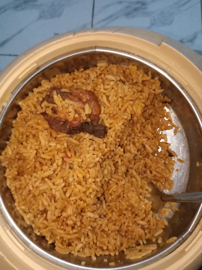 A top-down shot features a silver container filled with golden-brown rice. A piece of cooked chicken rests on top of the rice towards the upper left. A silver serving spoon is partially visible on the right side of the container. The container has a beige exterior. The background shows a marbled blue and white surface. The overall presentation suggests a homemade meal, possibly biryani or a similar rice dish.