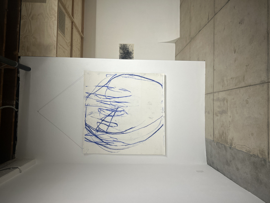 An interior space features unfinished walls of plywood and concrete. A white surface dominates the central view. On this surface hangs a white canvas with chaotic blue lines. A faint diamond shape is lightly marked to the left of the canvas. Above, a small, framed artwork hangs on a white wall, partially obscured. A strip of white paper peels away from the wall near the concrete. The floor is white.