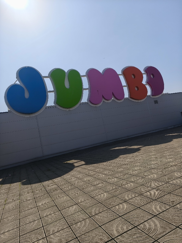 - "A low-angle, exterior view captures the upper portion of a commercial building featuring a large "JUMBO" sign under a clear, bright blue sky with the sun visible in the upper left quadrant" by FM-DbwwD3, licensed under CC BY 4.0