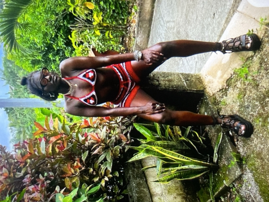 A woman with dark skin is posing in a red and white crochet bikini top and shorts. She is wearing sunglasses, a necklace, and bracelets. Her hair is in a bun. She is lying on a concrete structure surrounded by lush green foliage. Her legs are stretched out and she is wearing black strappy sandals. The setting appears to be a tropical garden.