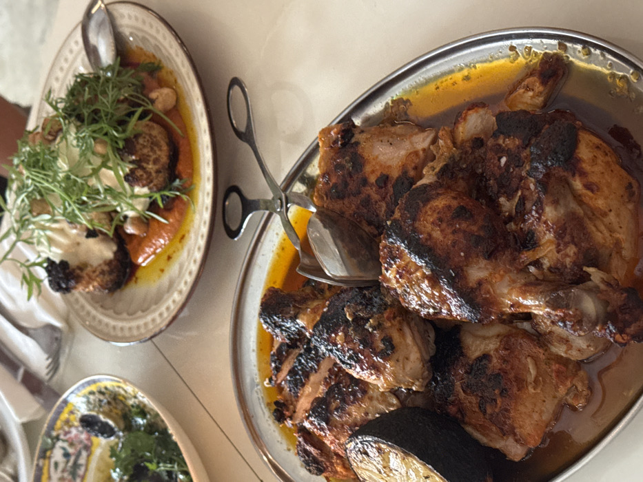 A top-down shot reveals two plates and a small bowl of food. On the left, a plate holds fried items topped with white sauce and herbs. To the right, a silver platter is laden with roasted chicken and vegetables in a rich, oily sauce. A pair of silver tongs and a spoon rest atop the platter. The bottom left corner shows a glimpse of another dish, filled with green herbs and possibly lemon. The arrangement suggests a shared meal.