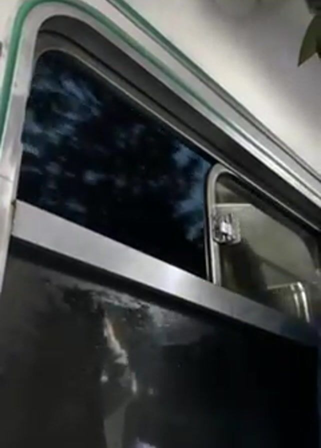 Here's a breakdown of the video: A man with glasses peers into a train window. The window is partially open, revealing a small, rectangular pane secured with a latch. Outside, the world passes by in a dark blur. The interior of the train features a white wall adorned with floral decorations. The man briefly holds up what appears to be a phone or small object. The overall lighting is subdued.