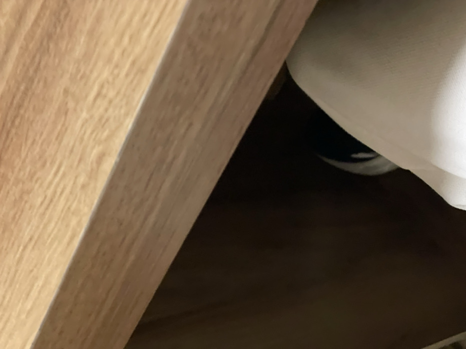 The scene, located in Al-Muhajerin Municipality, Syria, displays a close-up, downward-angled view of an indoor environment. The upper two-thirds of the frame are occupied by the smooth, light-brown surface of a wooden desk or countertop, exhibiting horizontal wood grain patterns. Its front edge runs diagonally from the upper left to the mid-right. Below this wooden surface, the area is significantly darker, indicative of shadows. In the lower right quadrant, a portion of an individual's lower leg is visible. The leg is clad in light-colored, possibly off-white, fabric trousers. Behind the leg, a segment of a dark-colored shoe or sneaker is partially discernible. No specific actions or interactions are depicted; the scene is static with a partial view of a person's lower extremity under a wooden fixture.