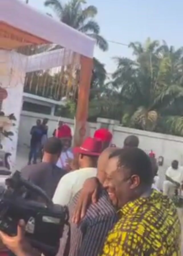 gathering of people outdoors on a sunny day. Some of the men are wearing traditional attire, including red hats. Some individuals greet each other with hugs. A man with a camera is filming. A white tent or structure with drapes is visible in the background. There are trees and a building in the background. The overall atmosphere appears celebratory or social.