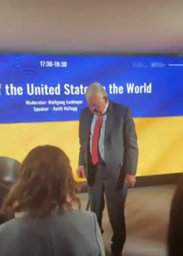 A man in a dark suit, light blue shirt, and red patterned tie stands on a stage in front of a screen that reads "of the United States in the World." The time 17:30-18:30 is printed at the top of the screen. Wolfgang Ischinger is listed as the moderator and Keith Kellogg is listed as the speaker. The man in the suit looks down at the floor, then slowly stands up. Other people sit in chairs at the front of the stage, facing the audience, but they are not visible. Some members of the audience are visible in the foreground.