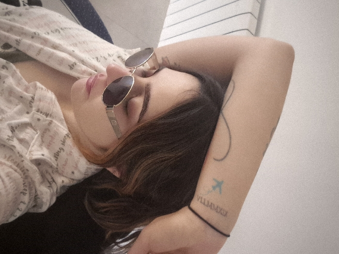 The scene is located in Tixeraïne, Algeria. A close-up, angled shot depicts a young woman in repose, her eyes appearing closed or partially closed. She is wearing oval-shaped sunglasses with dark lenses and thin, gold-colored frames. Her hair, dark brown with lighter highlights, rests around her face and against her raised right arm. She is dressed in a light-colored, possibly cream, collared shirt patterned with faint script-like text; a darker garment or strap is visible beneath it. Her right arm is bent and raised, with the hand seemingly resting on or near her head. Distinct tattoos are visible on her arms: an infinity symbol on the visible portion of her left arm, and on her right arm, a small airplane symbol accompanied by the Roman numerals "VII.MMXXI". A black elastic band encircles her right wrist. The background is light-toned, featuring a white and dark striped pattern on the left, indicative of a headboard or wall, and a dark, indistinct area on the right. No active interactions are depicted; the subject appears to be resting in an indoor environment.