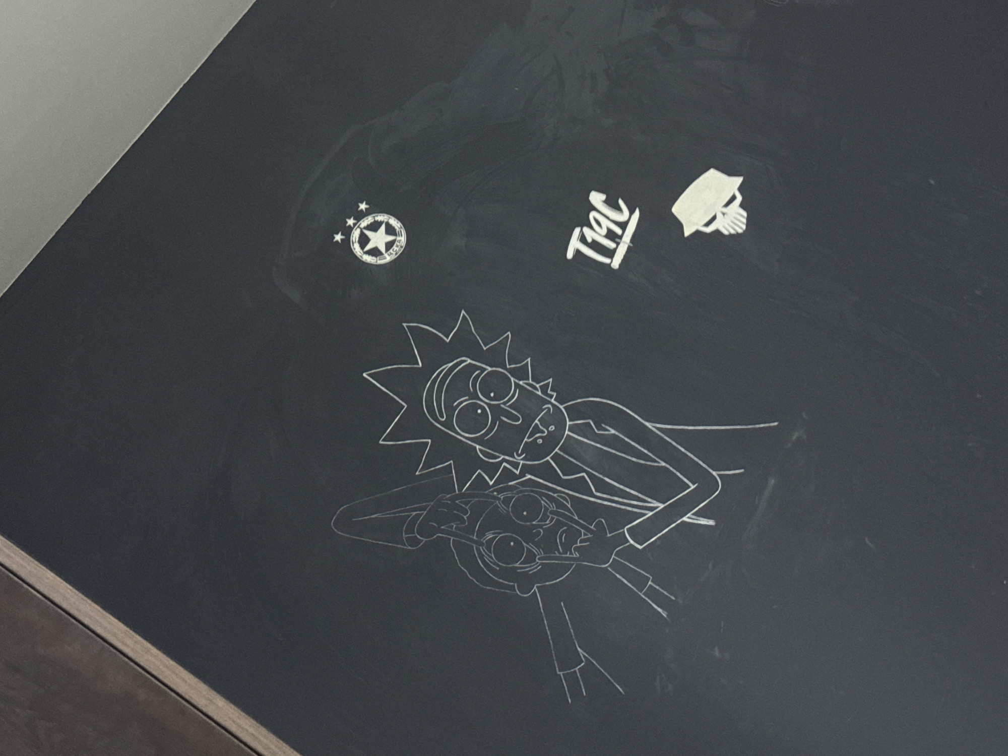 section of a dark, matte surface, likely a tabletop, with chalk-like drawings. Dominating the center are cartoon-style depictions of Rick and Morty characters. Above them are three other drawings: a star symbol with smaller stars around it, the letters "T19C" in a stylized font, and a skull wearing a military-style cap. The surface appears slightly smudged, indicating it may be a chalkboard or a similar material where drawings can be easily wiped off. No indication is given about the location, or city of Pleven, Bulgaria.