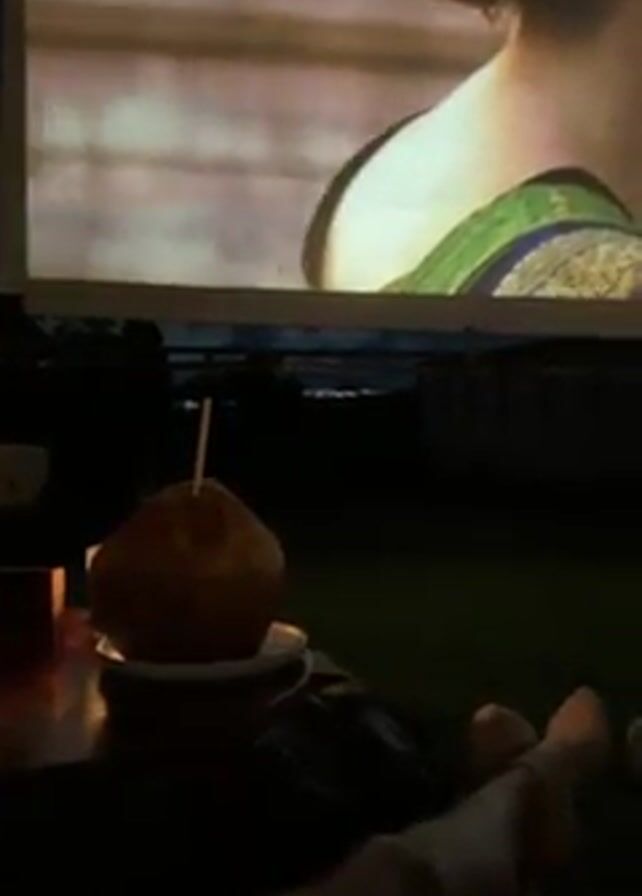 The video depicts an outdoor movie setting at night. The film playing on the screen features Julia Roberts in a scene where she is embracing a man in a white shirt. In the foreground, there is a wooden table with a young coconut drink, a small candle, and what appears to be a coaster. Two pairs of bare feet are also visible in the lower part of the frame. The background features a dark, indistinct view of buildings or vegetation. The overall atmosphere suggests a relaxed, intimate movie night experience.