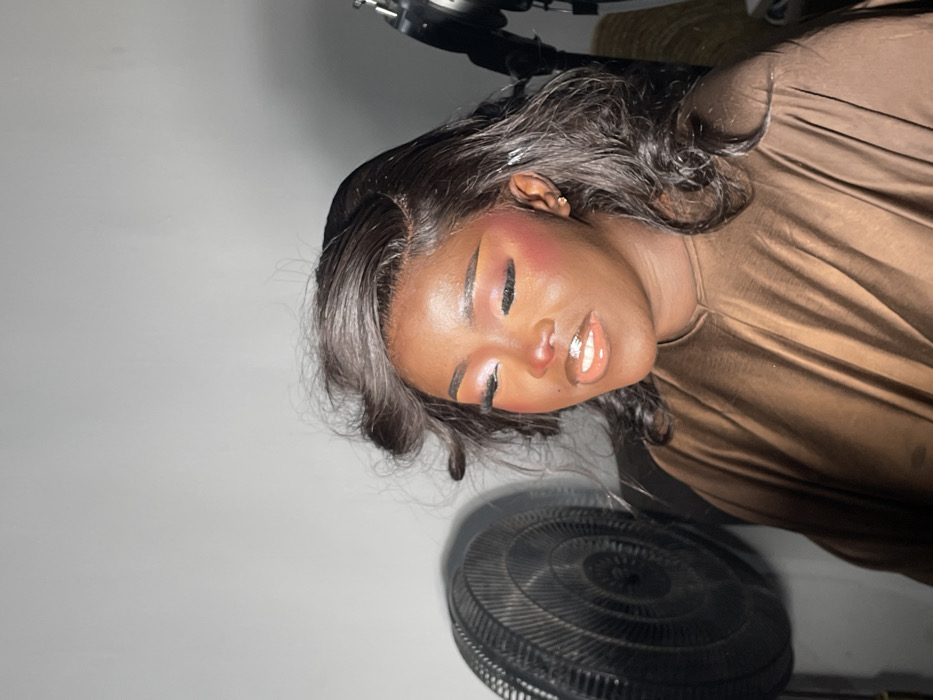 A person with dark skin and a brown top poses with eyes closed. The individual sports a wig with dark, wavy hair. The face is adorned with makeup, including blush and lip gloss. A fan is visible in the lower part of the image, and there is another object above the person's head. The background appears to be a plain white wall.