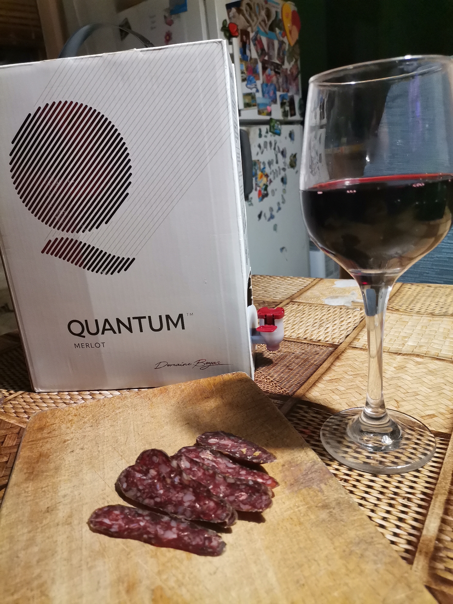 A close-up, eye-level shot in a kitchen or dining area in Obrochishte, Bulgaria, depicts a casual setting for wine and charcuterie. In the center-left, a white 'QUANTUM MERLOT' wine box from 'Domaine Boyar' stands upright, featuring a red and white spigot on its right side. The box has a design of a large circular form composed of parallel black diagonal lines. To the right of the wine box, a stemmed wine glass, partially filled with dark red wine, is positioned. In the immediate foreground, a light-colored wooden cutting board displays several slices of dark red cured sausage with visible white marbling. The table surface beneath these items is covered with a light brown woven mat. In the blurred background, a white refrigerator adorned with numerous magnets and papers is visible behind the wine glass, with a darker surface or wall beyond it. No individuals are present in the frame.