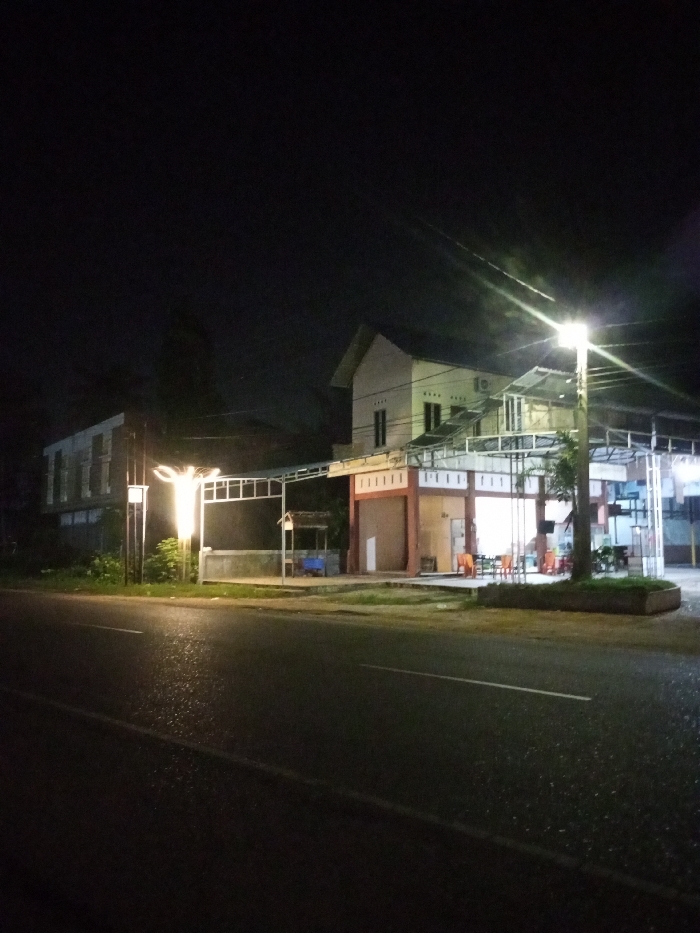 This image depicts a nighttime street scene in Lhokseumawe, Indonesia