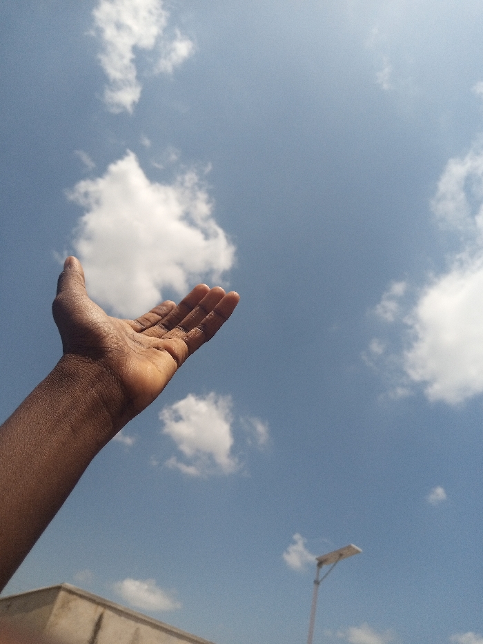 The image displays an upward-angled view against a bright blue sky with scattered white cumulus clouds, observed in Narayi, Nigeria. A dark-skinned human left arm and hand are positioned in the foreground, extending upwards from the lower-left, with the palm facing slightly right and fingers gently curved. No jewelry or unique markings are visible on the hand. In the lower-left background, a section of a light-colored, possibly concrete building structure is partially visible. Towards the lower-right background, a slender pole-mounted fixture, consistent with a solar-powered LED street light, is present against the sky. The scene is illuminated by strong daylight.