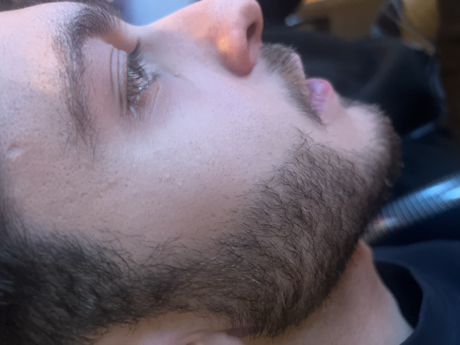 A close-up, low-angle shot focuses on a person's face looking upwards. The image captures the left eye, part of the forehead with a visible scar, the nose, upper lip, and a beard. The skin appears textured with visible pores and a slight sheen. The beard is dark and fairly short, showing individual hairs. A dark, blurred background suggests an indoor setting.