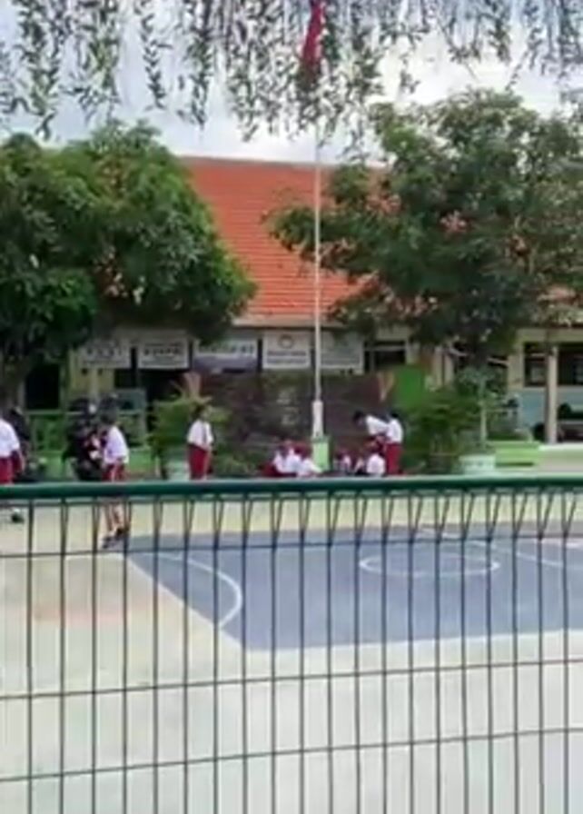 schoolyard in what appears to be Indonesia. There are children in red and white uniforms playing on the basketball court, some of whom are wearing white headscarves. The court is surrounded by a green fence, and beyond it is a school building with a red tile roof. The video is taken from behind the fence and shows the children entering or leaving the court. The atmosphere seems lively and active.