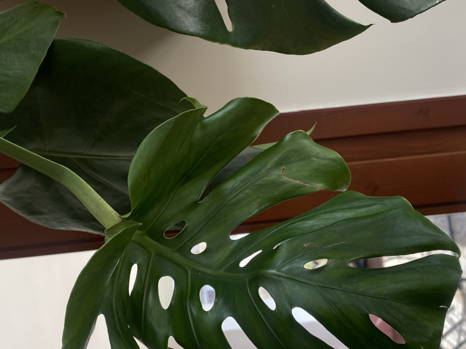 The image depicts a close-up, vertical view of a vibrant green Monstera deliciosa plant in an indoor environment. The specific location within the city of Dobri dial, Bulgaria, cannot be determined from the visual evidence. The primary subject is a large, deeply lobed leaf featuring multiple characteristic fenestrations (natural holes) and marginal splits, dominating the left and central portion of the frame. This leaf displays a rich, glossy dark green color. A prominent, thick green petiole (leaf stalk) extends upwards from the leaf's base, positioned centrally. Another, less distinct, darker green leaf is partially visible in the upper right background. The background primarily consists of a dark brown wooden structure, likely a window or door frame, running vertically and horizontally behind the plant. To the right of this wooden element, a light, neutral-toned wall is visible. Reflections of bright light are discernible through the leaf's fenestrations and in the background, suggesting proximity to a window or significant light source. A minor, linear brown blemish is present on the lower right section of the prominent leaf. No people, animals, or specific actions are depicted.