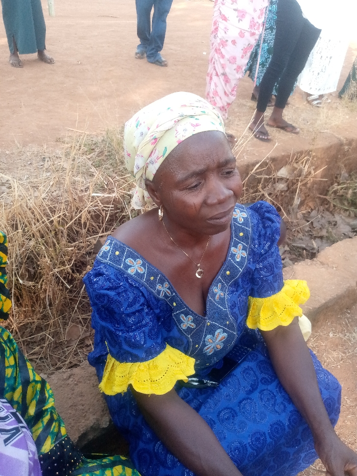An older woman sits outdoors, wearing a blue dress with yellow lace trim and a light-colored headscarf with a floral print. She has dark skin, wears a gold pendant necklace and earrings, and appears to be looking downwards. The ground is dry and brown, with some dry grass. People are standing in the background, partially visible. The overall image suggests a somber mood, possibly a gathering or event.