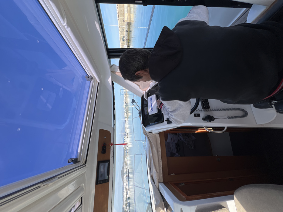 A male individual is observed from behind and to the right, seated at the helm of a powerboat in a marina in M'diq, Morocco. He wears a black hooded vest over a light grey long-sleeved shirt. His hands are positioned on the controls of the white helm console, which features a "LOWRANCE" brand marine electronics display prominently mounted. Additional controls, switches, and a coiled microphone handset are visible on the console. The boat's interior features white panels, wooden trim, and large clear glass windows offering a panoramic view of the marina. A retractable blue-tinted glass sunroof is open overhead, revealing a clear blue sky. Another digital display is mounted on a wooden panel above the main windshield, with a red decorative tassel hanging below it. To the left, an open wooden door leads into a forward cabin, revealing a dark floor and some items of clothing or bedding. The external environment consists of calm, clear blue-green water. Numerous white pleasure yachts and boats are moored in the distance across the marina. A green, hilly coastline with scattered buildings forms the background. To the right, a concrete breakwater or pier is visible, with larger port infrastructure or cranes discernable further down the bay. The scene is illuminated by bright daylight under a clear, cloudless blue sky.