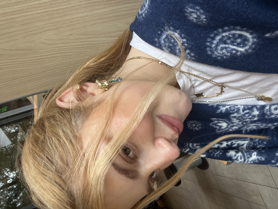 A fair-skinned woman with light blonde hair is shown in a close-up, tilted shot. She wears multiple gold necklaces and various earrings, including a gold hoop and a floral design. Her eye color is light brown. She is wearing a white t-shirt and a navy blue and white patterned garment. The background is a light wooden surface with a hint of greenery visible through a window.