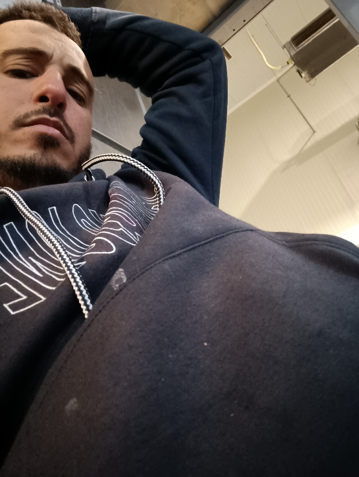 A man with dark hair and a trimmed beard is captured in a low-angle, close-up selfie. He is reclined, his arm bent behind his head, with his gaze directed towards the camera. He is wearing a dark hoodie with a pattern and drawstring. The background is out of focus and appears to be a neutral-colored indoor space, including a ceiling with what seems to be ventilation.