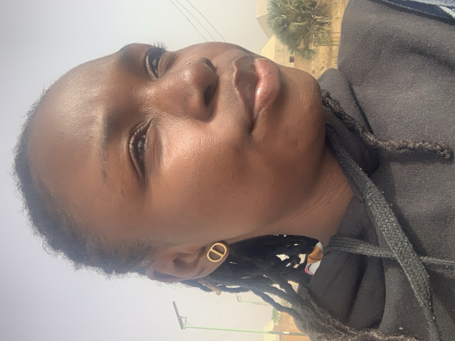 A dark-skinned individual, identified as female, is depicted in a close-up, chest-up outdoor shot in Tempure, Nigeria