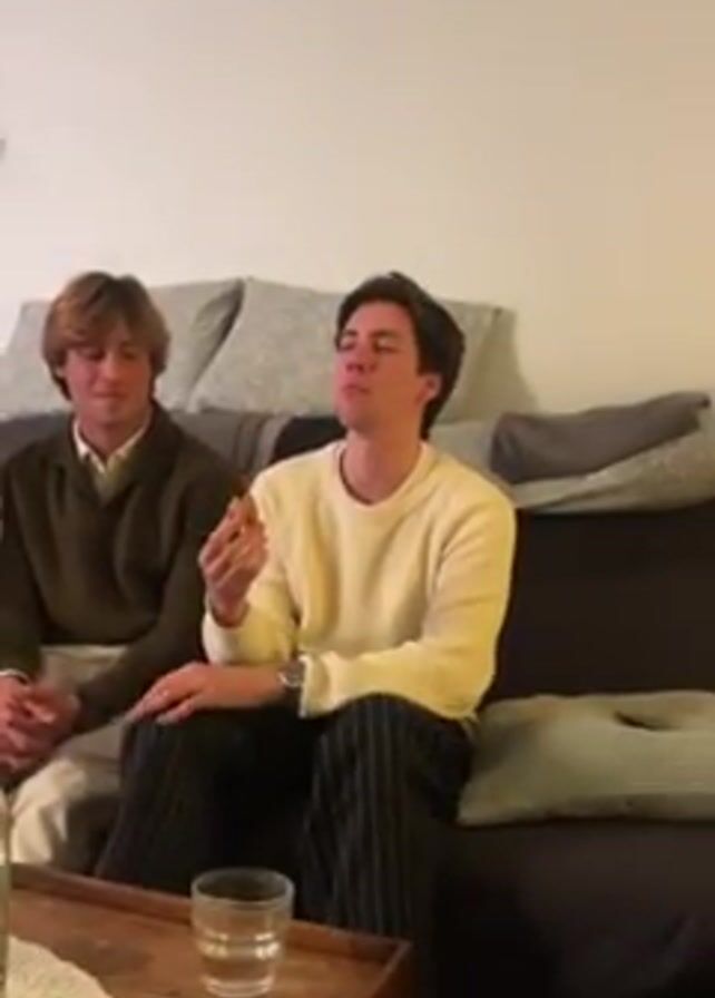 Two men are sitting on a gray couch. The man on the right is holding a small brown object in his hand and puts it in his mouth. The man on the left is looking at the other man. There is a small wooden table in front of them with a glass of liquid on it. The wall behind the couch is white.