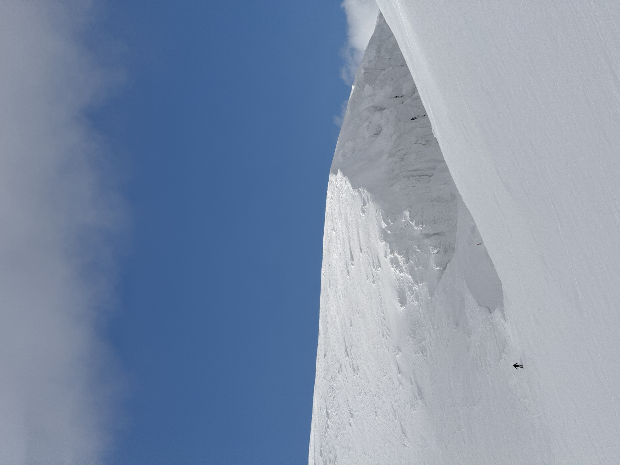 A wide shot depicts a snow-covered mountainside next to a partly cloudy blue sky. In the middle-right of the image, a small figure, possibly a person, can be seen on the snow. The scene is seemingly remote and unpopulated. The location is not discernible from the image.