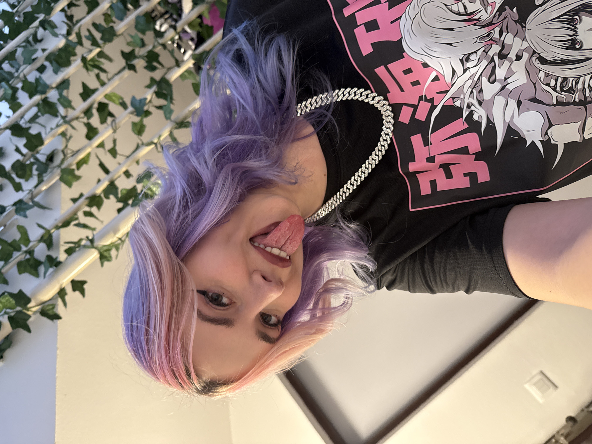 A woman with two-toned lavender and pink hair, wearing a black shirt with a pink and white graphic and a diamond necklace, is sticking her tongue out in a selfie. The background includes a wall with ivy decorations. The location cannot be determined from the information provided.