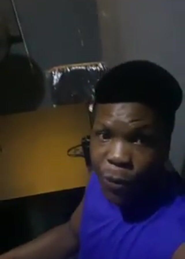 A man in a blue tank top and a black baseball cap is in what appears to be a dimly lit room. He looks directly at the camera, and wipes his forehead with his hand. Behind him, there is a desk with items on it, some of which are partially obscured. The walls are a solid, dark color. The lighting is poor, and the overall setting is basic and unremarkable.