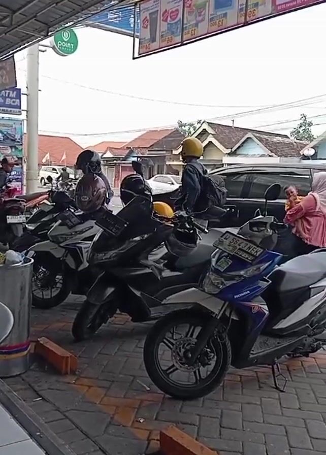 The scene takes place under the awning of an Alfamart convenience store in what appears to be a residential area. Several motorbikes, including Honda models, are parked closely together on a paved surface marked with yellow lines and short orange bricks. The sky is overcast, giving the scene a somewhat muted quality. A woman wearing a light pink top and a hijab carries a young child. She walks past a parked black car, towards the side of the building. Various advertisement posters are displayed beneath the awning, promoting different products. The backdrop includes single-story houses with visible roofs. The atmosphere seems ordinary and casual.
