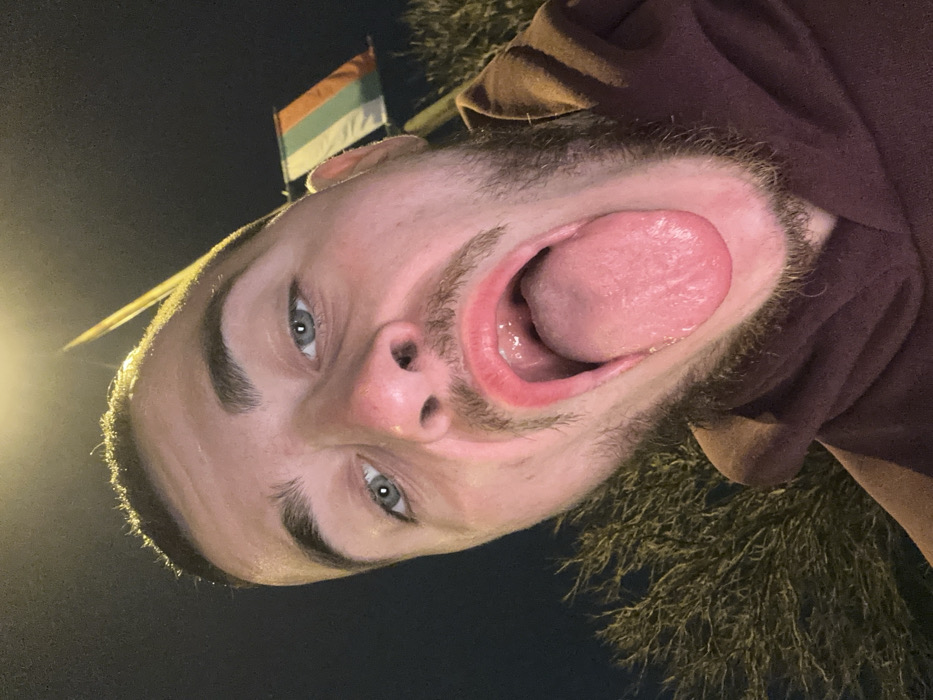 The image depicts a close-up, wide-angle selfie of a young adult male taken outdoors at night in the city of Sliven, Bulgaria. The individual, seen from a low angle looking upwards towards the camera, has short dark hair, light-colored eyes, and a short beard or stubble. He is wearing a dark brown or maroon hooded sweatshirt. His mouth is wide open, with his tongue fully extended outwards towards the camera. The background is dark, indicating nighttime. An overhead artificial light source casts a yellowish glow on the top of the subject's head and illuminates parts of the upper background. A vertical yellow pole, possibly a lamppost, extends upwards from behind the subject's head in the upper-center to upper-right. To the right of the subject's head, in the upper-right background, a flag with horizontal stripes of green (top), white (middle), and orange (bottom) is attached to a pole. In the lower-left background, sparse, dark-toned branches of a tree or bush are visible. The overall setting is an urban public area.