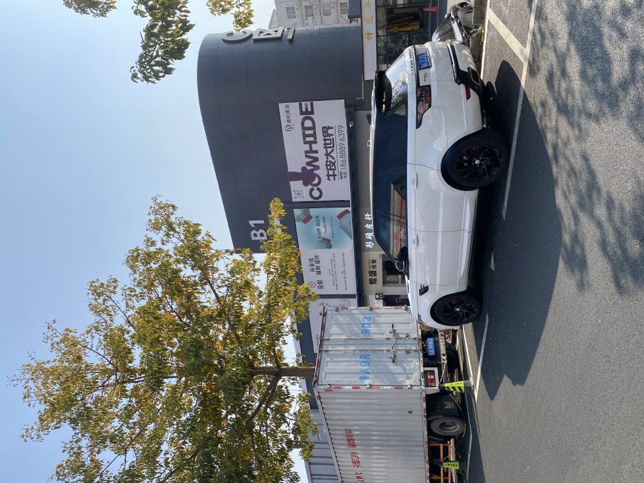A white Range Rover parked on the street next to a building with a large "B1" sign. A "COWHIDE" advertisement is prominently displayed with the text "牛皮大世界" and a phone number: 18688896399. A white truck with "AGR" and "803" markings is behind the car. Street shadows are cast on the asphalt. A tree with yellowing leaves is visible on the left side. The Chinese text "煌盛彩頭皮行" and "辅料超纤" appear as well.