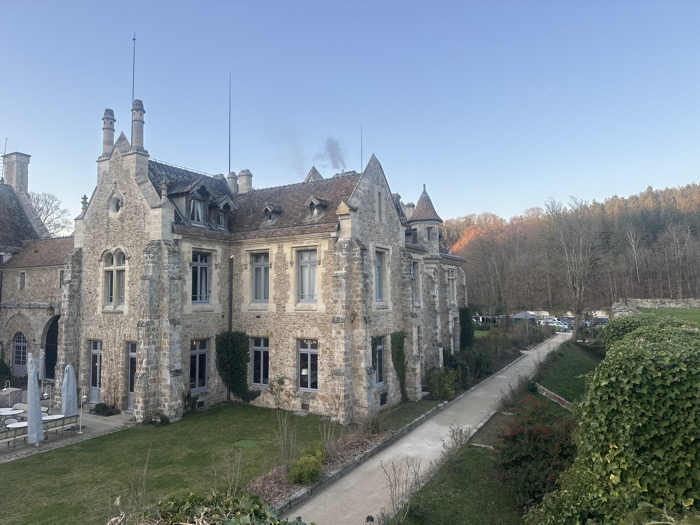 An exterior view of a grand, stone building with intricate architectural details like turrets, pointed arches, and chimneys with smoke rising from one. A pathway extends along the side of the building, lined with greenery and leading towards a forested area in the background. Tables and umbrellas are visible on a lawn adjacent to the building, suggesting an outdoor seating area. The overall scene presents a serene, historic atmosphere.