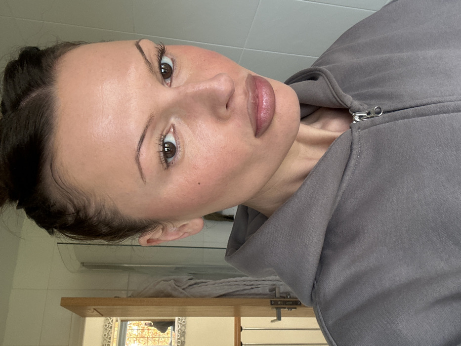 A female individual is depicted in a close-up, slightly off-center portrait. She has dark hair styled in an updo, a fair complexion with a slight blush on the cheeks, thin arched eyebrows, dark brown eyes, and full lips with a neutral-toned lip color. A small dark mark is visible on her left cheek. She is wearing a grey hooded sweatshirt with a partially zipped silver-colored zipper. The background features an indoor setting. To the left, a light wooden door frame with a silver handle is visible, and through the doorway, a window with a grid-patterned or leaded glass pane and a vague reflection can be seen. To the right, a curved glass shower screen or partition suggests a bathroom environment. A light-colored garment, possibly a towel or robe, hangs behind the door frame. The specific location within the city of Wealden, United Kingdom, cannot be determined from the visual information provided.