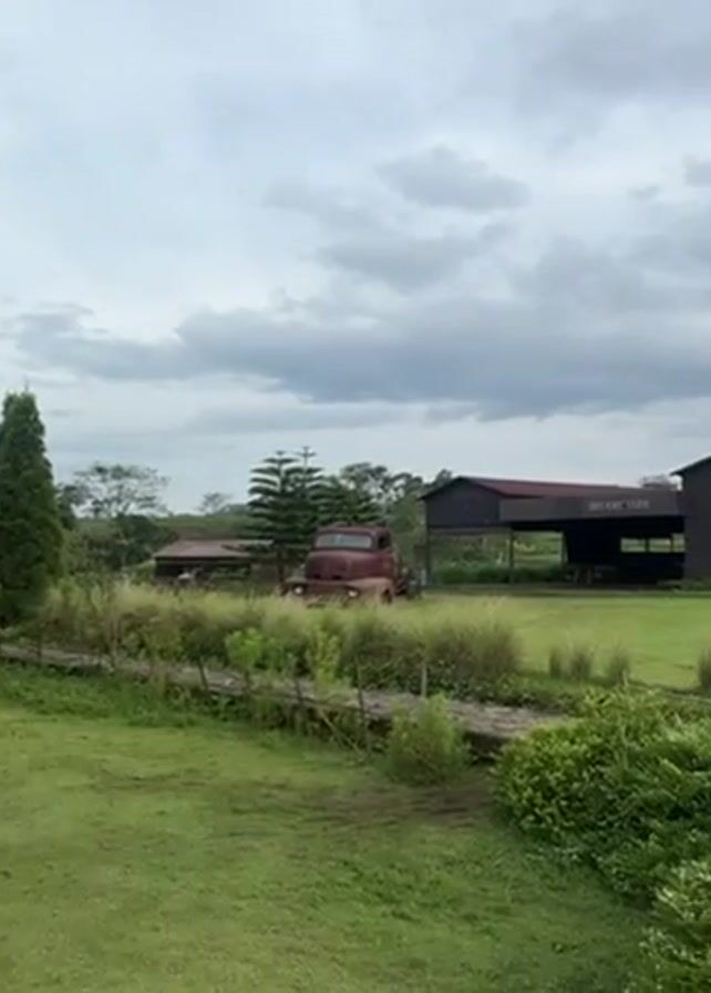 scenic view of a farm on a cloudy day. There's a large grassy area with trees and a rusty old truck. Several buildings, including a barn-like structure with "ORGANIC FARM" written on it, are visible. A wooden signpost points in different directions. A person walks along a paved path. In the background, mountains can be seen.