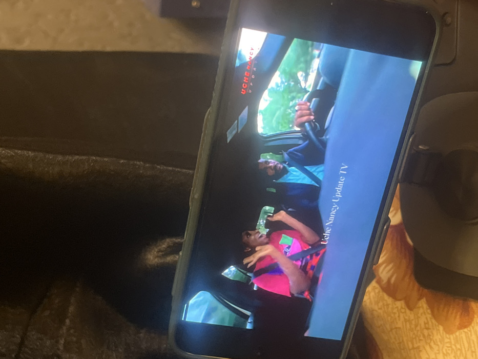 A smartphone displaying a video titled "Uche Nancy Update TV". The video shows two individuals inside a car; one is driving and the other is in the passenger seat. The passenger wears a bright pink shirt with a colorful pattern. The driver wears a blue shirt and a seatbelt. The phone rests at an angle on a dark surface, with a black object and a patterned surface visible in the background.