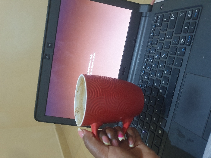 A black Dell laptop is shown with a mug of coffee placed on its keyboard. The laptop screen displays a "Getting Windows ready" message. A hand with manicured nails holds the mug. The mug is red with a swirling pattern and contains remnants of coffee. The background is a plain beige or light yellow color, possibly a wall or surface.