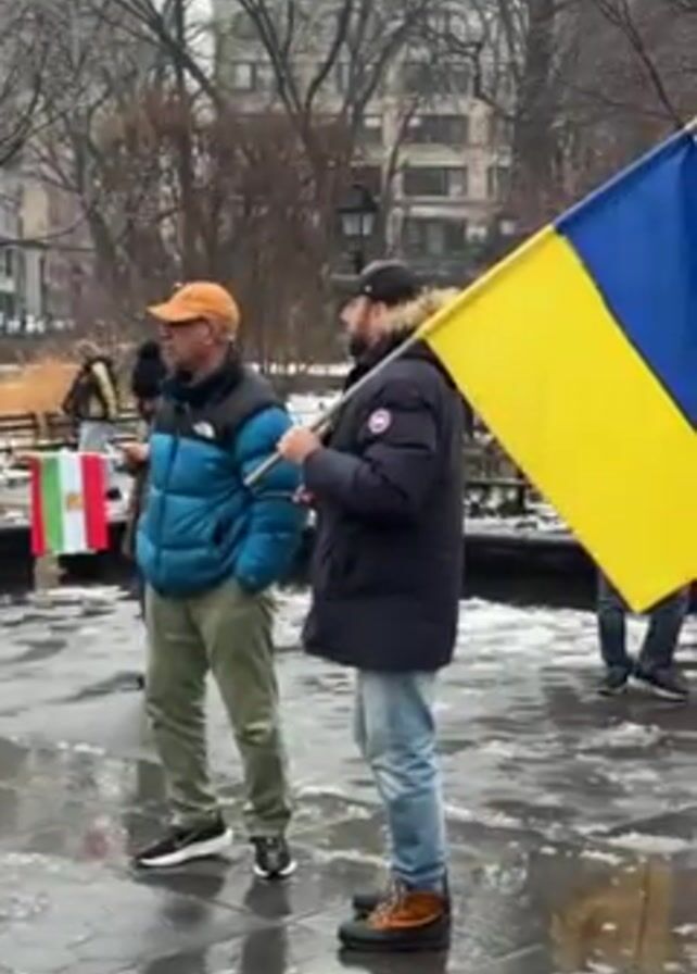 group of people standing in an outdoor area that appears to be a park or square. The ground is wet and potentially icy. Two men are prominently visible in the foreground. One man is wearing an orange cap, a blue puffer jacket, and khaki pants. The other man is wearing a black jacket with a fur-lined hood, blue jeans, and brown boots. He is holding a Ukrainian flag. To the right of them, another person is holding a flag with green, white, and red stripes with a golden emblem in the center, resembling the flag of Iran. Several other people are in the background, walking or standing around. Some bare trees are visible in the background, indicating it is likely winter or early spring. The overall impression is of a public gathering or demonstration, possibly related to current events.