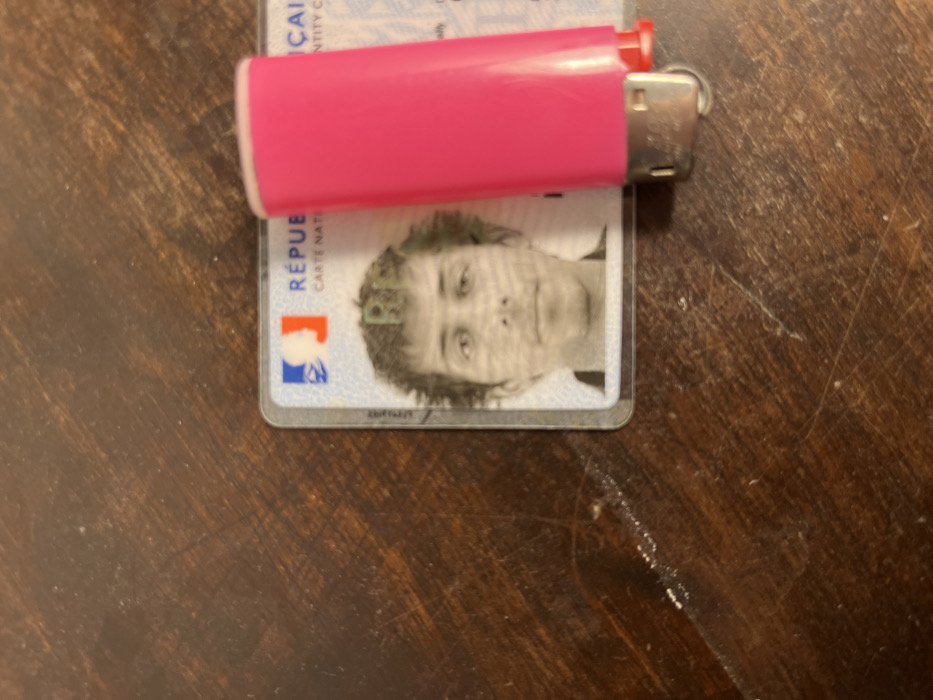 A pink lighter rests atop a French Carte Nationale d'Identité