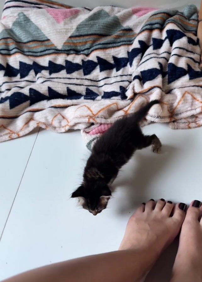 A very small, black and brown kitten moves around on a white tile floor. The person recording the video has bare feet with dark nail polish. The person has a tattoo on their arm and a white watch on their wrist. The person brings their hand closer to the kitten. A patterned blanket is behind the kitten. An electrical outlet is visible on the wall behind the blanket.
