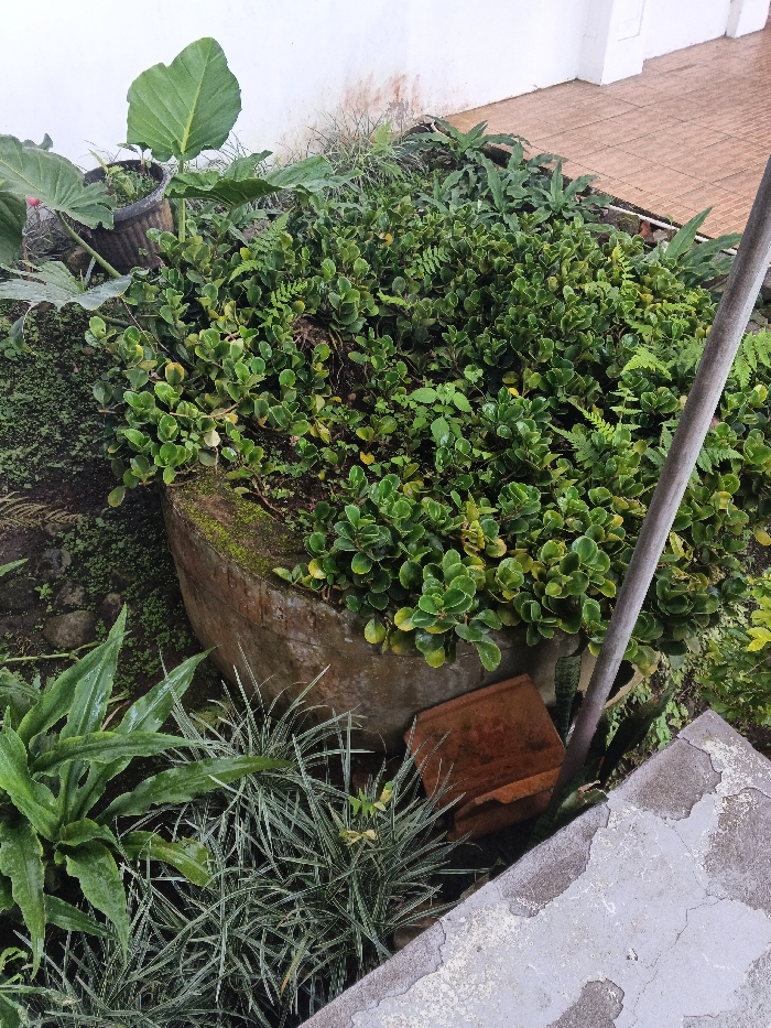 This image depicts an outdoor garden area, identified by provided context as being in Akshatau, Kazakhstan. The scene is densely vegetated. In the foreground, a section of light-colored concrete or stone with visible peeling paint and cracks occupies the lower right. Adjacent to this, a cluster of thin-bladed, variegated green plants grows. To the immediate left, larger broad-leaf green plants are present. The midground is dominated by a large, cylindrical concrete planter, appearing weathered with green moss covering portions of its rim and sides. This planter is filled with a dense array of small-leaved green shrubs and ferns. To the lower right of the planter, a broken, reddish-brown terracotta pot lies on its side. A dark grey metal pole extends vertically from the lower right of the frame, positioned between the concrete surface and the planter. The ground to the left of the planter is composed of dark soil mixed with scattered small rocks and various low-lying green plants. The background features a plain white wall, exhibiting some discoloration and dirt marks near its base on the left side. A brown tiled floor or pathway runs along the base of the wall from the mid-right towards the upper right. In the upper left corner, a large-leafed plant in a black plastic pot is partially visible against the white wall, surrounded by additional assorted green foliage. No individuals or active interactions are visible.