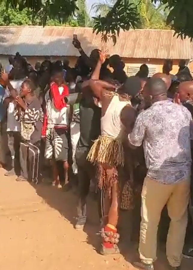 large group of people gathered outdoors in what appears to be a village or rural area. The majority of individuals are men, dressed in a mix of casual clothing, including shorts, tank tops, t-shirts, and jeans. A few people stand out due to their unique attire, such as one man wearing a colorful yellow patterned outfit and another in a traditional-looking skirt made of raffia or similar material. The group seems excited and animated, with some individuals gesturing or moving, suggesting a celebratory atmosphere or event taking place. In the background, there are simple, single-story buildings with corrugated metal roofs, indicative of modest housing. Trees provide some shade and add to the natural environment. The ground is sandy or dirt, which is typical for less urbanized locations. Some motorbikes are visible in the distance, implying a mode of transportation used in the area.