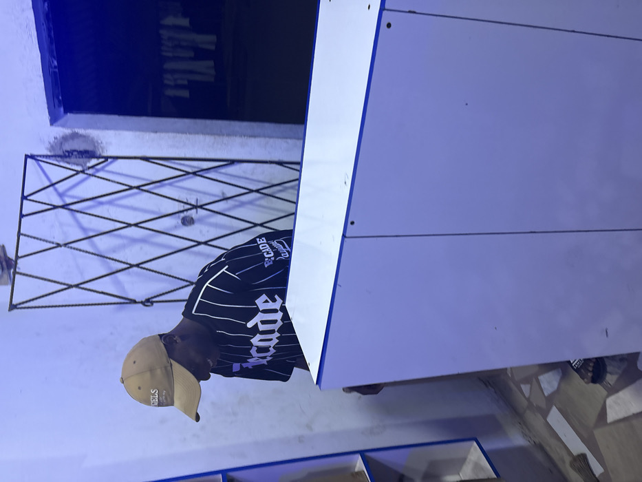 The scene depicts an interior setting, identified as being in the city of Ikot Ekpene, Nigeria. A single male individual stands in the midground, positioned behind a white counter or cabinet unit. He wears a tan baseball cap with text (partially obscured), a black t-shirt with white vertical pinstripes and the word "Arcade" prominently displayed in white text on the chest, and dark sandals. His head is tilted downwards, and he exhibits a slight smile. The white counter, with a visible blue trim along its top edge, occupies the foreground and extends across the lower right portion of the image. To the left of the counter, a white shelving unit with blue trim is partially visible. The floor is tiled with light-colored, possibly patterned, tiles, and a small broom is present on the floor to the far left. In the background, a white wall is visible. A dark, diamond-patterned metal security gate or grill is affixed to this wall. To the right of the security gate, an open doorway reveals a darker area beyond, where multiple items resembling clothes are hanging on what appears to be a line or rail. The lighting in the scene suggests an indoor environment, with a distinct blue cast impacting the white surfaces.