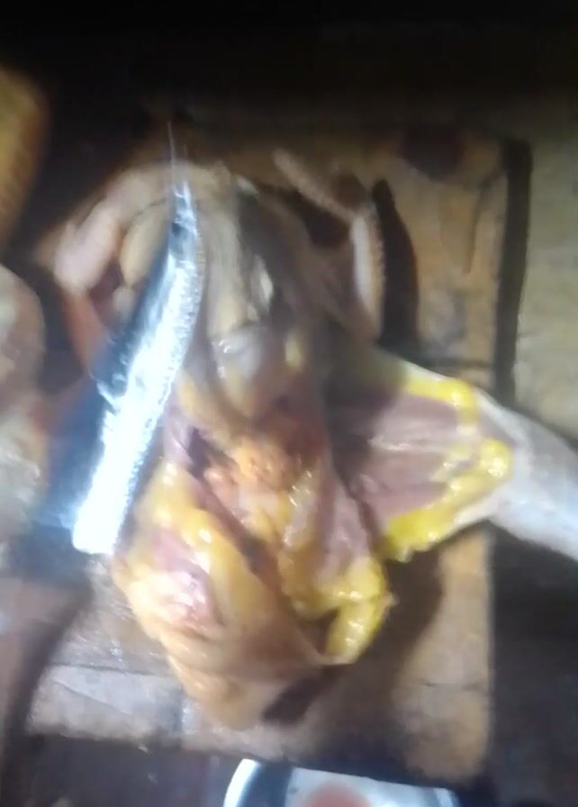 person using a knife to cut up a raw chicken on a wooden cutting board. The chicken appears to be partially dissected, with some internal organs visible. The knife is silver with a wooden handle. A small metal bowl with a red liquid is visible in the corner of the frame. The lighting is dim, making some details difficult to discern. A foot is partially visible in the top right corner.