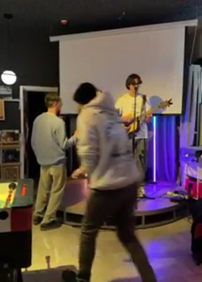 Two musicians, a young man playing acoustic guitar and a young woman singing into a microphone, stand on a small, round stage in what appears to be a bar or small venue. They are positioned in front of a white projector screen and a blue light panel. A man in a light blue sweater and khakis is facing them, gesturing with his hands as if giving direction. Another person wearing a beanie walks by in the foreground. A foosball table is visible on the left. The ceiling is dark with a speckled pattern.