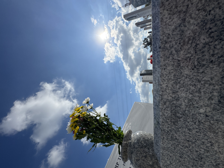 This image captures a low-angle perspective within a cemetery located in Nof HaGalil, Israel, under a bright, partly cloudy sky. In the immediate foreground, the textured, speckled grey surface of a granite tombstone dominates the lower portion of the frame. Resting on this tombstone, towards the left, is a matching speckled grey granite vase containing a bouquet of fresh flowers, predominantly white and yellow chrysanthemums with some purple accents. Behind the vase and flowers, a polished white tombstone is partially visible, displaying etched Hebrew text including "מיר ת" and the number "19". The midground reveals several other tombstones of varying designs and heights, crafted from granite and marble, some light and some dark. Small red objects, possibly memorial candles or stones, are interspersed among these distant grave markers. Utility wires stretch horizontally across the sky in the midground, and a dark industrial structure or power pylon is partially visible on the far right horizon. The background consists of a clear blue sky dotted with white cumulus clouds. The sun, partially obscured by a cloud, is prominent in the upper right, casting a bright glare and indicating strong daylight conditions. No individuals are present in the scene.