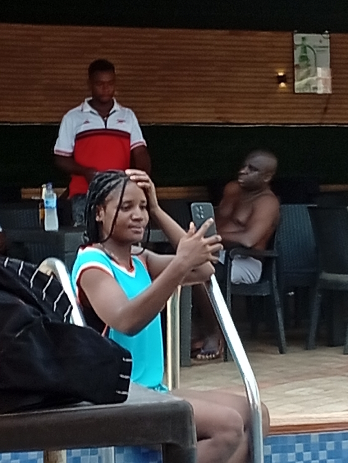 A woman in a blue tank top is taking a selfie with a smartphone while sitting by a pool. Behind her, a man in a white and red polo shirt stands, and another man with no shirt is seated, watching. A bottle of water sits on a nearby table. The background shows a textured wall with a light fixture and a sign. A black bag is partially visible in the foreground.