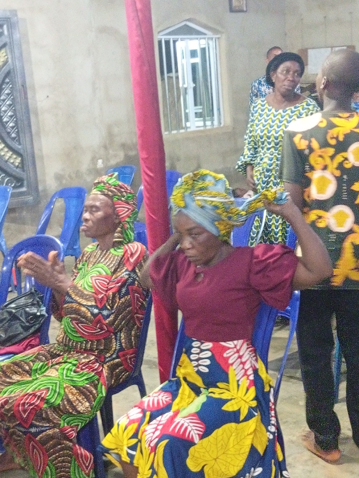 Several people are seated in blue plastic chairs. The woman on the left wears a green, brown, and red patterned dress and head covering. The woman in the center wears a maroon shirt and a blue skirt with yellow and red flowers. She is adjusting her blue and yellow head covering. Behind them, a woman in a green and yellow patterned dress stands next to a man in a black and yellow shirt. A red pole is also visible in the shot. A window with bars is in the background.