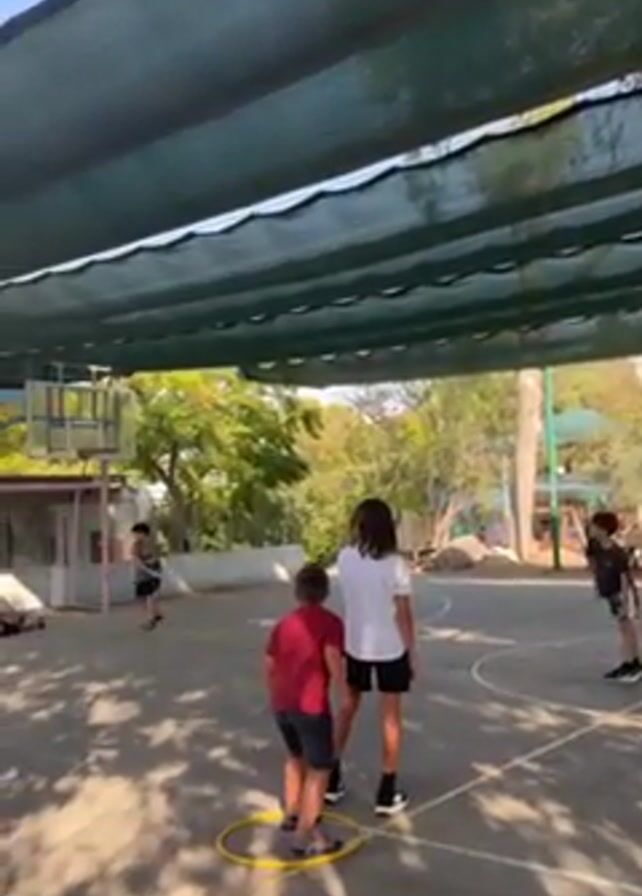 basketball court with several children. One child wears a red shirt and dark shorts while standing inside of a yellow hoop. Another child wears a white shirt and dark shorts while standing next to the child in the hoop. Other children are also on the court; one near the basketball hoop, and another near the edge of the court. The court is surrounded by trees and other greenery. The court is covered by a green mesh canopy. The video is shot from under the canopy. The audio includes children talking and making noise.