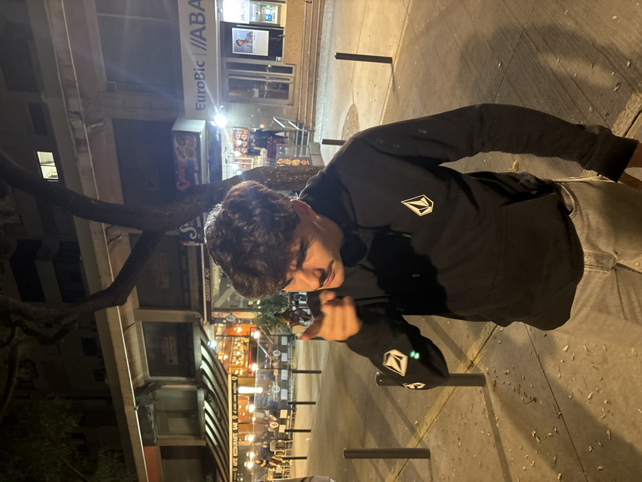 The image displays a nighttime urban street scene in Lisbon, Portugal, specifically identifiable near Avenida Duque de Ávila due to visible storefronts including "ARTE RESTAURANTE BAR D'ONDA CAFE," "OAKBERRY AÇAÍ," "Spicy," and "EuroBic" and "ABANCA" bank branches. A young male individual, approximately in his late teens or early twenties, occupies the center-foreground. He possesses short, dark, curly hair and a dark mustache. He wears a black hooded sweatshirt, featuring a white Volcom logo on the chest and additional smaller Volcom logos on the left sleeve, paired with light-colored jeans. His right arm is raised, with the index finger extended and pointed directly towards the camera or viewer. His facial expression is serious and direct. Behind the subject, a tree trunk and branches are prominent, extending into the upper portion of the frame. To the subject's left, "ARTE RESTAURANTE BAR D'ONDA CAFE" is illuminated, displaying striped awnings, visible interior seating, and several patrons. To the right, storefronts for "OAKBERRY AÇAÍ," "Spicy," and "EuroBic" are brightly lit, with the "EuroBic" branch showing an integrated ATM and a partially visible "ABANCA" sign adjacent to it. The ground is a concrete sidewalk with several dark, cylindrical bollards. Scattered dry leaves are visible on the pavement. In the background, multi-story buildings line the street, some with illuminated windows on their upper floors. The scene is lit by artificial light sources, casting shadows and highlighting the primary subject.