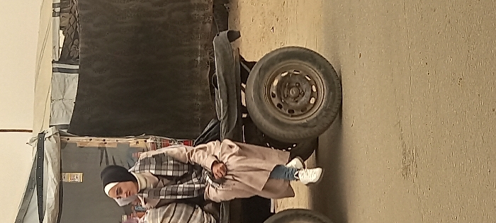 A person wearing a head covering and a mask sits amidst a chaotic outdoor setting. A large tire rests nearby, possibly leaning against a vehicle or structure. The surrounding area appears cluttered with various items, including fabrics and what seems to be a bed frame or tent. The ground has a weathered, textured appearance. The overall impression is one of an informal or makeshift living space outdoors.